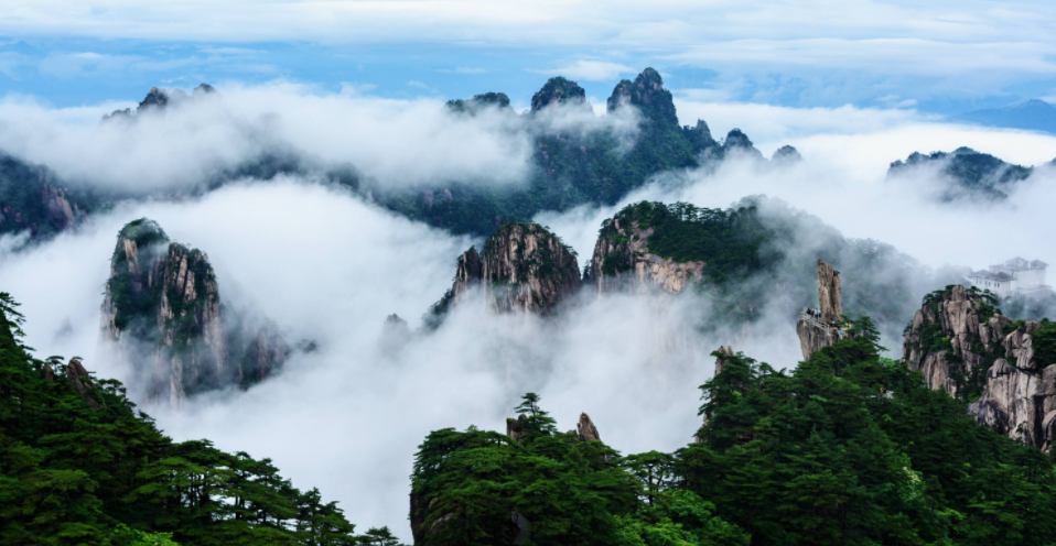 黄山云海不仅本身是一种独特的自然景观,而且还把黄山峰林装扮得犹如蓬莱仙境,令人置身其中,神思飞越,浮想联翩,仿佛进入梦幻世界。依云海分布方位,全山有东海、南海、西海、北海和天海;而登莲花峰、天都峰、光明顶则可尽收诸海于眼底,领略“海到尽头天是岸,山登绝顶我为峰”之境地。