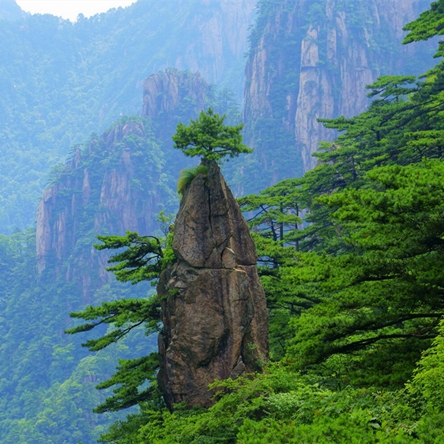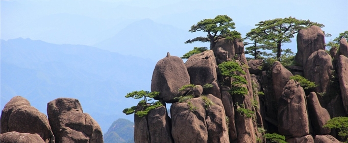 黄山奇松以石为母,以云为乳,七十二峰,处处都有青松点染,如一支支神奇的画笔,把五百里黄山抹上了生命的色彩。黄山松是由黄山独特地貌、气候而形成的中国松树的一种变种。黄山松一般生长在海拔800米以上的地方,通常是黄山北坡在1500-1700米处,南坡在1000-1600米处。黄山松的千姿百态和黄山自然环境有着很大的关系。黄山松的种子能够被风送到花岗岩的裂缝中去,以无坚不摧、有缝即入的钻劲,在那里发芽、生根、成长。