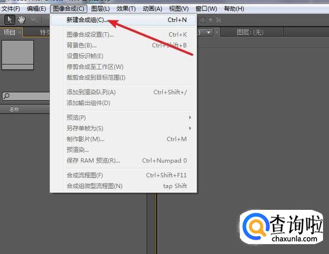 通过执行命令:“图像合成>新建合成组”,创建一个新的合成。