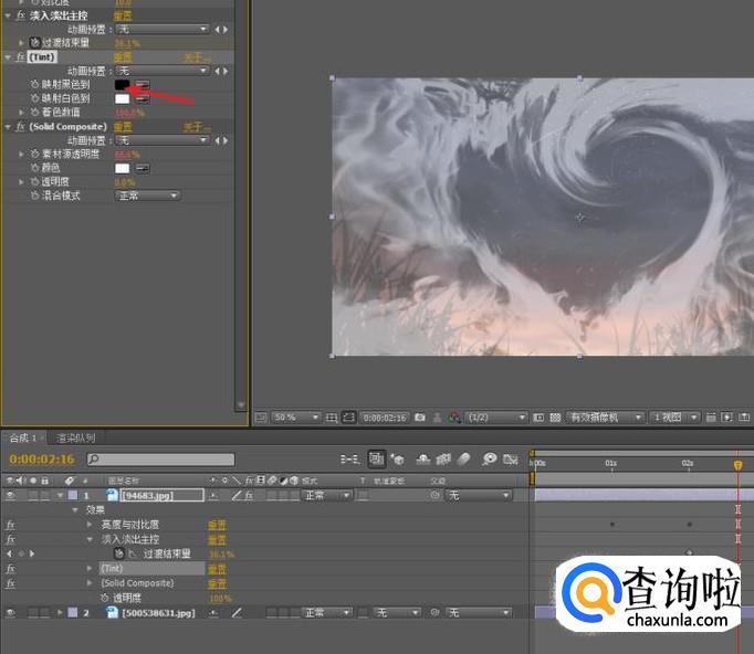 选择添加效果的图层,找到“Tint”效果,设定“映射黑色到”,将颜色更改为:“黑色”。