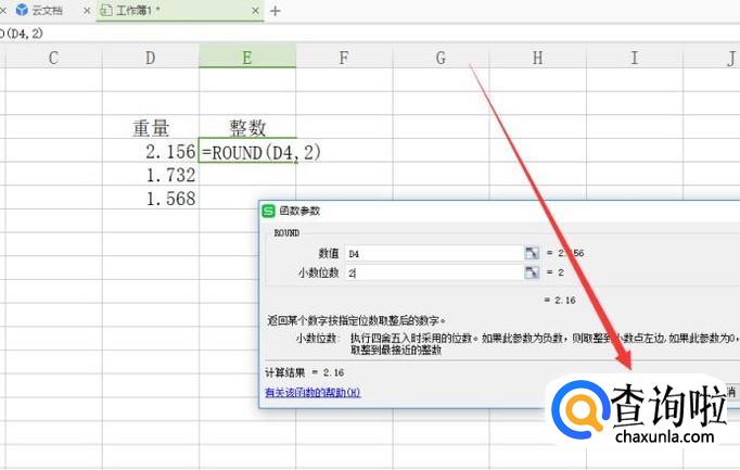 鼠标左键选择需要进行四舍五入的单元格,作为数值函数的参数,在小数位数里面输入想要保留的位数,如图所示。