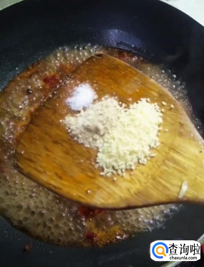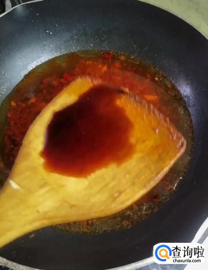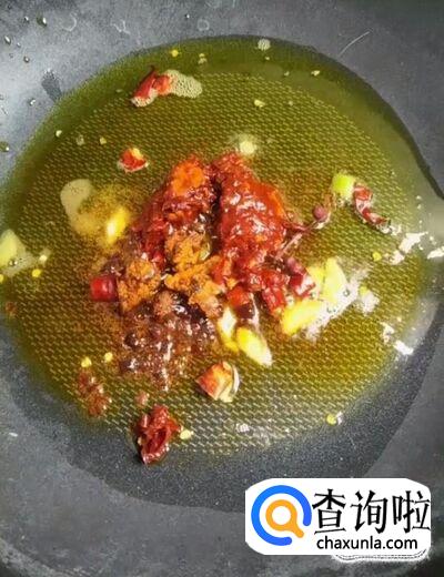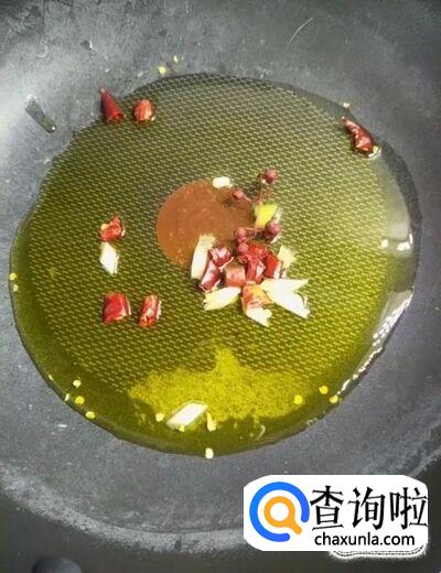 然后我们在一个干净的锅中加入少许油,油热放入葱姜,干辣椒,花椒,郫县豆瓣酱,火锅底料,爆香,炒出红油