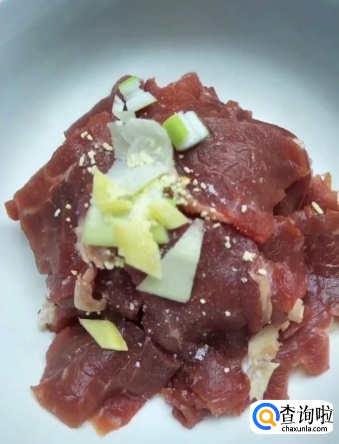 然后我们把牛肉片放入一个碗中,加入适量的葱姜,盐,鸡精,料酒,一个鸡蛋清,抓拌均匀,腌制10分钟