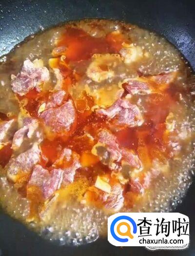 然后我们把腌制好的牛肉片放入锅中,煮熟关火