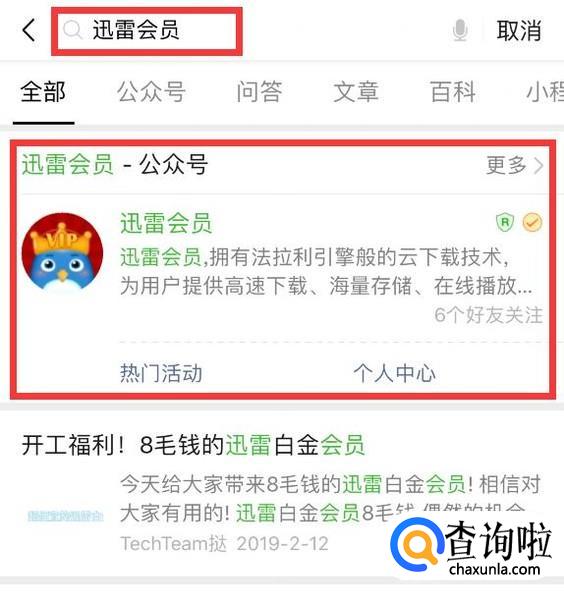 用手机微信搜索“迅雷会员”,找到迅雷会员公众号。