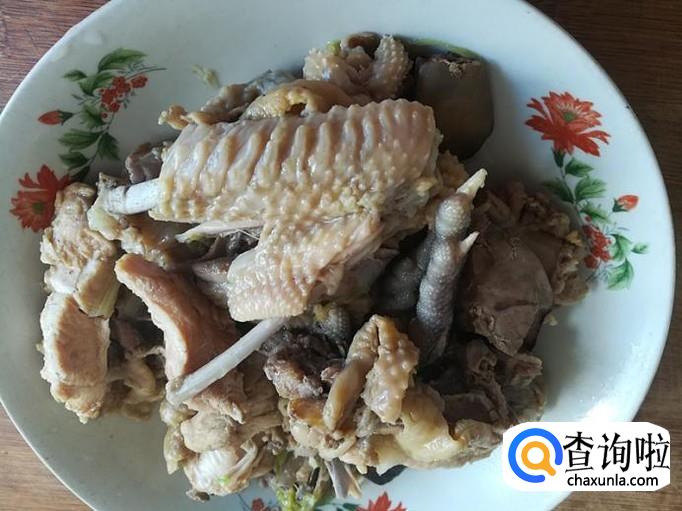 草鸡一只,洗净入锅,锅里加适量清水,开锅后去上面的沫子,再加适量的食盐、花椒、八角、桂皮、料酒、生姜、葱段等调料一起炖煮40分钟左右,捞出一部分装盘备用。