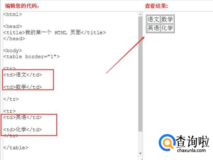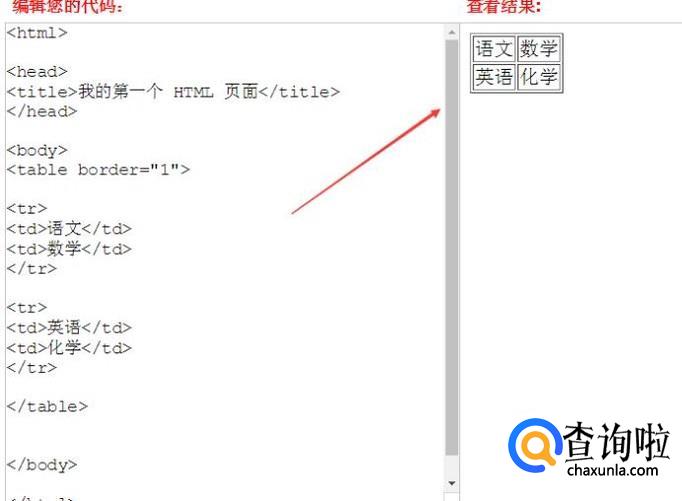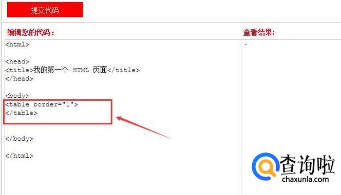 代码,先用<table>标签定义一个表格,其中border表示边框,border="1"表示边框为1个像素,数值越大,边框就越粗。
