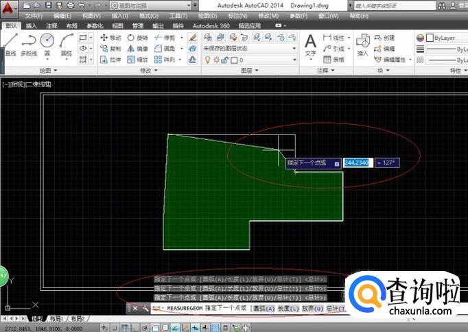 如图所示,命令窗口显示"MEASUREGEOM 指定下一个点或[圆弧(A)长度(L)放弃(U)总计(T)]"。依次拾取测量对象的下一个点,鼠标左键确认。