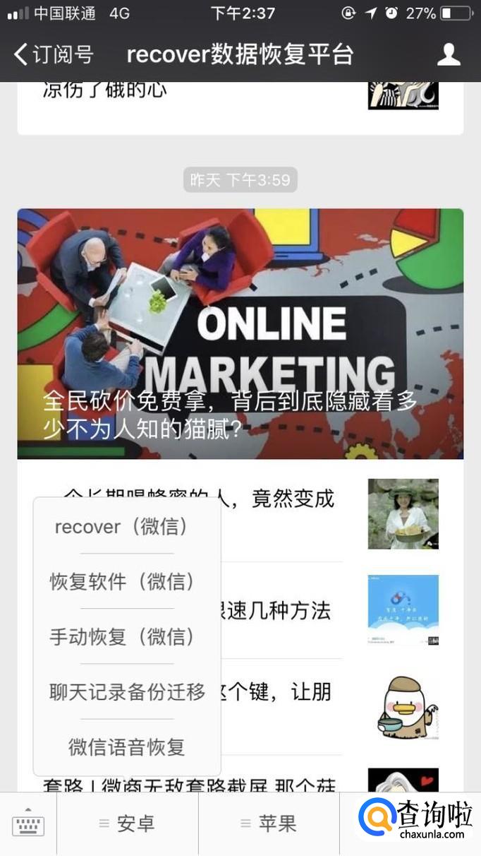 微信聊天记录误删后我们通常使用recover恢复,但是recover恢复微信聊天记录失败后不要着急,我们搜索微信公众号 “ recover数据恢复平台”