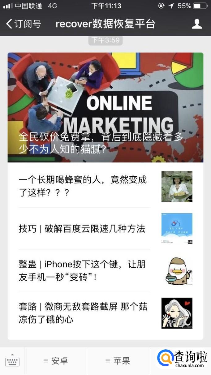 进入公众号后我们我们可以看到公众号的菜单页面 ——安卓,苹果,和历史消息