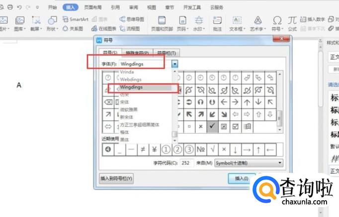 然后在弹出的窗口中,切换字体,选择【Wingdings】,如下图所示: