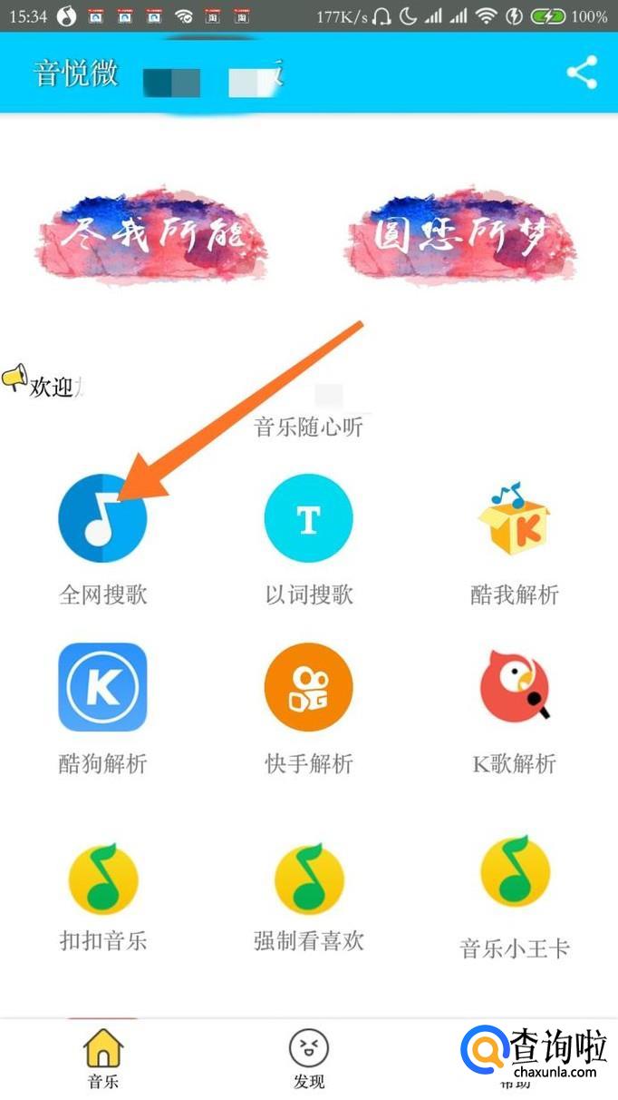 打开我们的音乐微,这是一个软件,就不说具体地址了,浏览器里面很好找到的,点击“全网搜歌”。