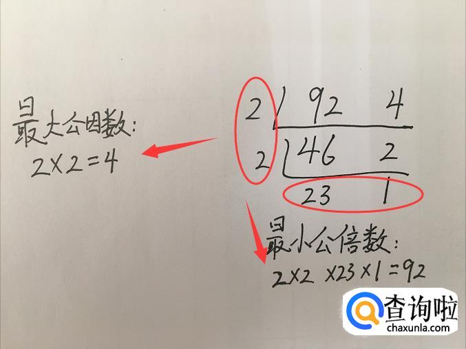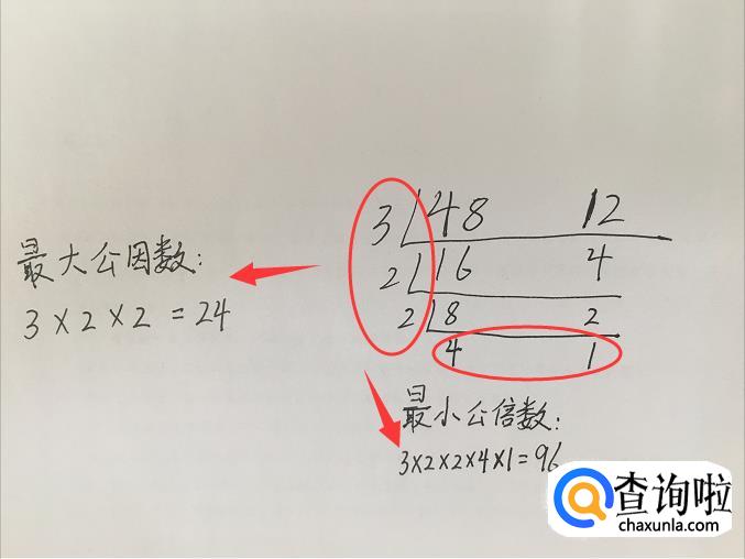 计算多的同学可以一眼看出来。短除法,先把两个要求的数列出来,然后画和除法反向的符号。左边写因数{我们所求就是最大,所以不必直接写出最大,一点点地推进才能算得准确},下面写除以左边因数后剩下的另外一个因数。如下图中:48的因数是3,剩下另一个因数就是16,12的因数是3,剩下另一个因数就是4,然后依次计算。20的因数是2,剩下另一个因数就是10,10的因数是2,剩下另一个因数就是5,第一次计算剩下的这两个公约数是5,除完之后分别剩下2和1。两个数的最大公因数就是左边的因数相乘:3×2×2=24。两个数的最小公倍数就是所有的因数相乘:3×2×2×4×1=96;同理第二个图也是这么计算。