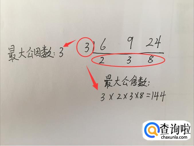 当遇到求多个数的最大公因数和最小公倍数时,方法是一样的,找他们的公因数,比如下图中三个数的最大公约数只有3,最大公倍数就是3×2×3×8=144。如果是1,最大公倍数就是他们的乘积。