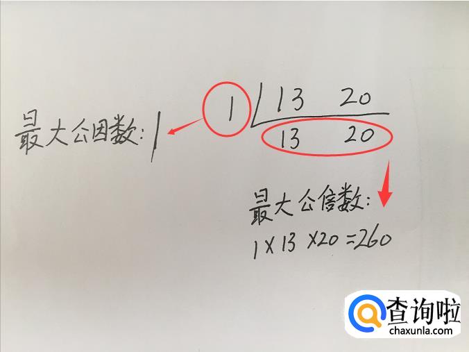 还有一种特殊的,公因数只有1的两个数。如下图中的13和20,他们的最大公因数只有1;最小公倍数,就是这两个数的乘积:1×13×20=260。