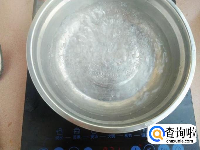 有砂锅的话就用砂锅,没有的话找个奶锅也行,我的奶锅在家里没带出来,只好随便找了个盆子了,里面加上适当清水,不用很多的,烧开。