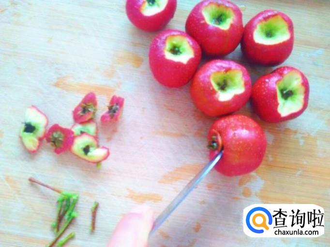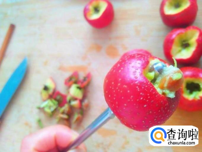 山楂里面是有山楂核的,这个用刀切的话不容易去掉,教你个窍门,找一根筷子,从山楂的那个小头往里钻过去,就能够直接把山楂核捣出来,非常简单。