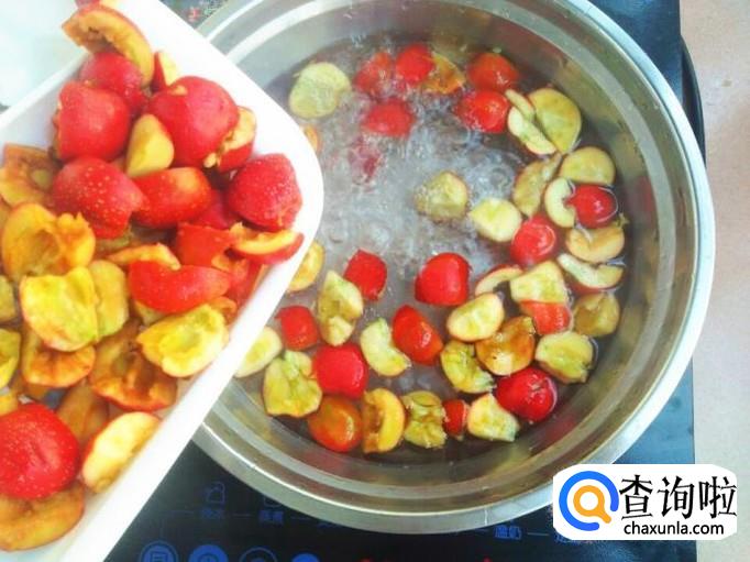 水烧开之后,把刚刚收拾干净切好的山楂块直接放进水里。
