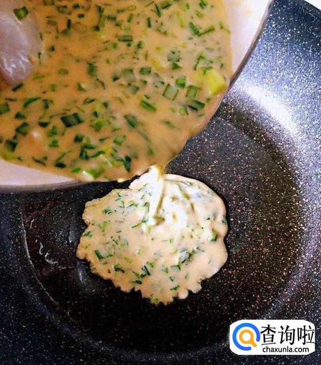 这样完美的煎饼面糊就已调制成功,取适量面糊放入摸好油的平底锅,煎至两面微黄就好。