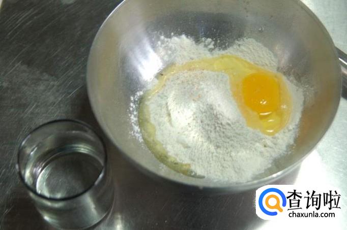 取适量面粉或玉米粉放入容器中,加入一小匙盐,一个鸡蛋,适量水准备调面糊。