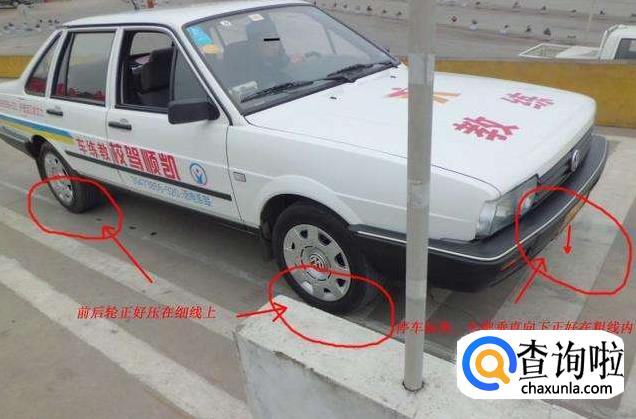 方向盘往右打四分之一,开到车头角盖线后往左打四分之一,看右镜后轮距离实线约一只脚掌的距离停车,没有的话方向盘微调。