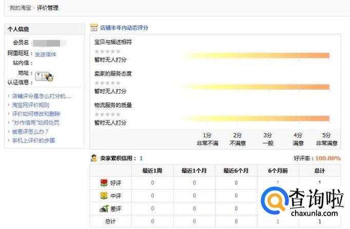 接着就可以看到店铺半年内动态评分,包括宝贝与描述评分、卖家服务态度评分以及物流服务评分,最下方卖家累计信用了