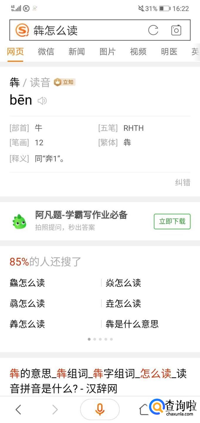最后,你需要查的字以及它的读音就会搜索给你呈现出来,比如查“犇”字的读音。