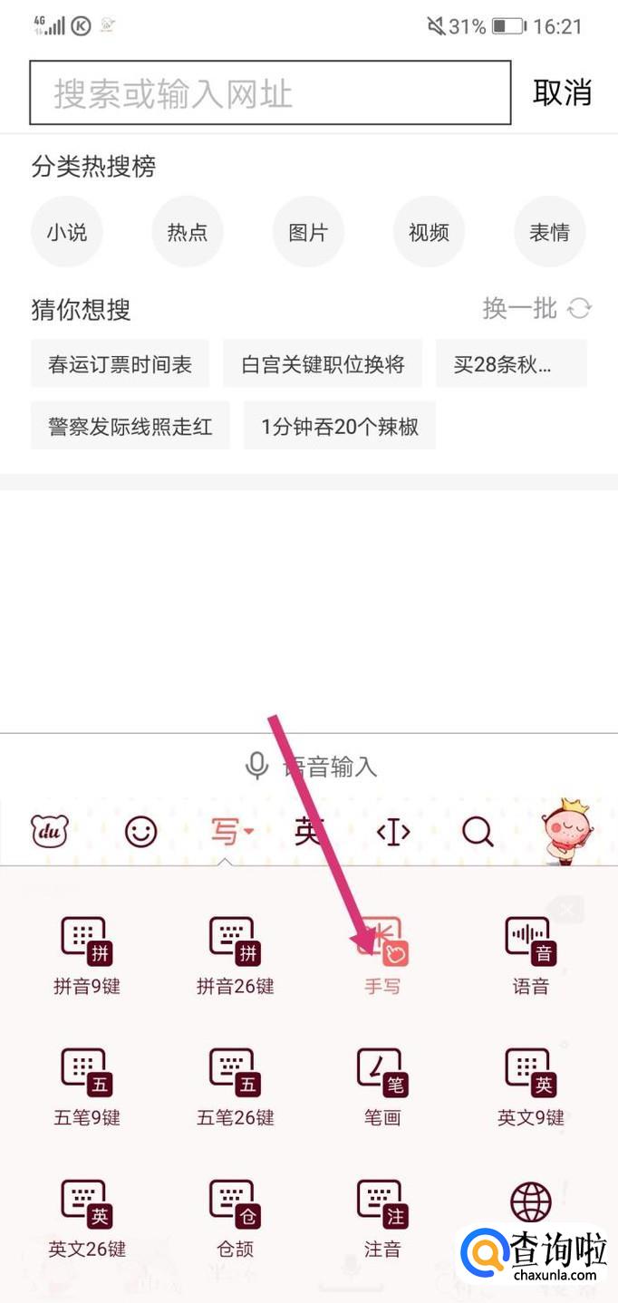 其次,如果想知道不认识的字的读音,你需要点击你手机打字的输入方式,改为“手写”。