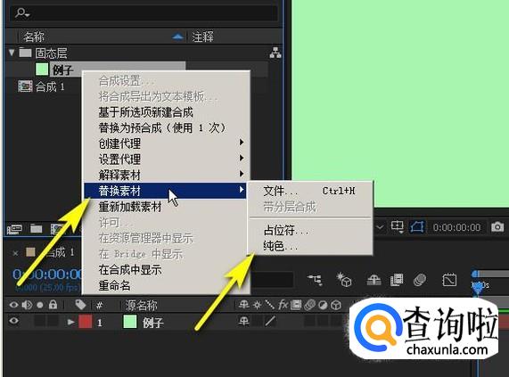 鼠标再右击“例子”;弹出的菜单中鼠标放在“替换素材”这里,右侧弹出子菜单再点:纯色