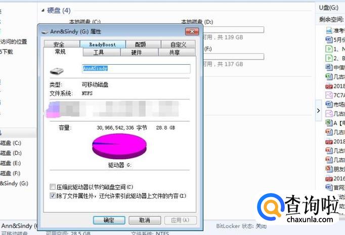 然后我们回到U盘所在的地方,我们打开U盘的”属性“,我们把U盘中需要备份的东西备份,然后查看一下U盘的格式是否是NTFS,如果是,就没有什么问题了。