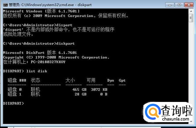 在DOS系统中,我们输入”diskpart“命令,调出系统磁盘,然后再输入”list disk“,就可以看到电脑上所有的磁盘了,这里也包括我们插在电脑上的U盘。这里我们可以看到U盘的实际大小。