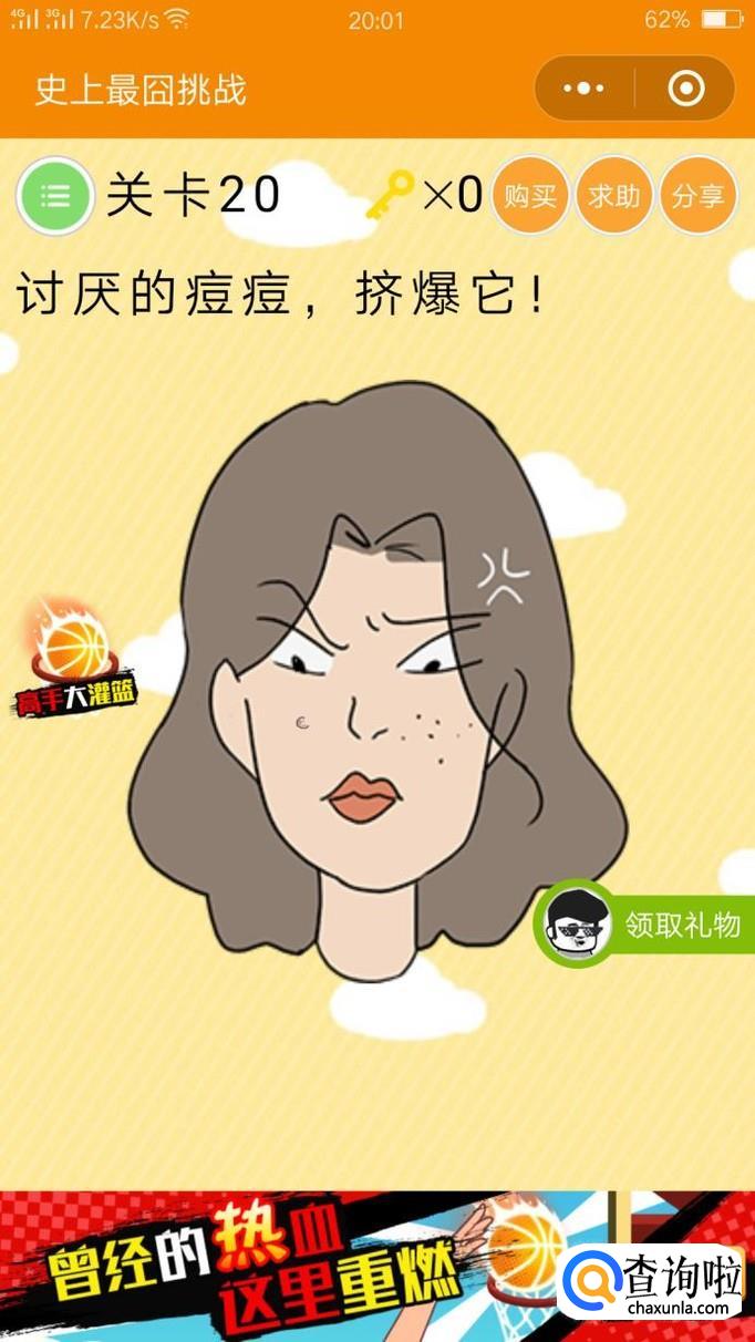 小编把前面的关卡都玩了哦,下图所示就是第20关,通关要求就是将痘痘挤爆,方法很简单哦。