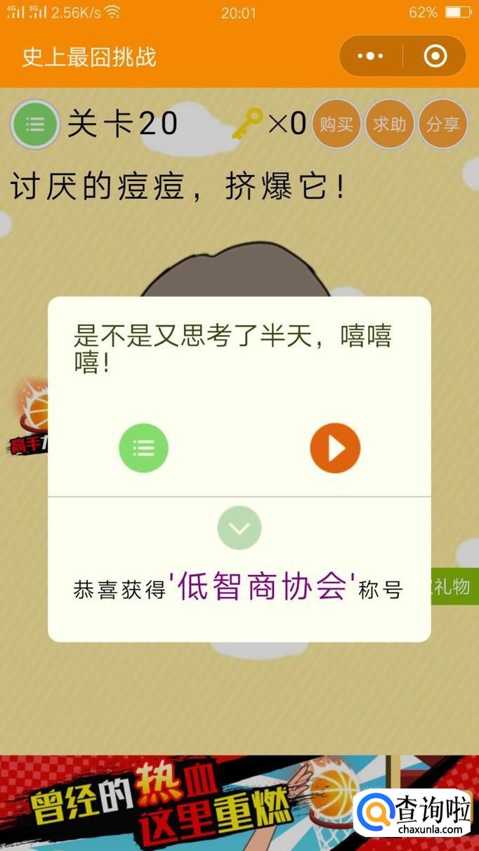 微信上有许多小程序游戏,史上最囧挑战就是其中一款小程序游戏,游戏有很多个关卡,那么第20关怎么过的呢?小编来教教大家,一起来看看吧!