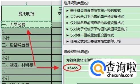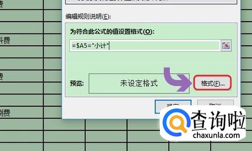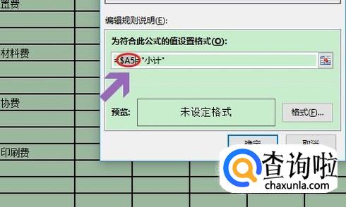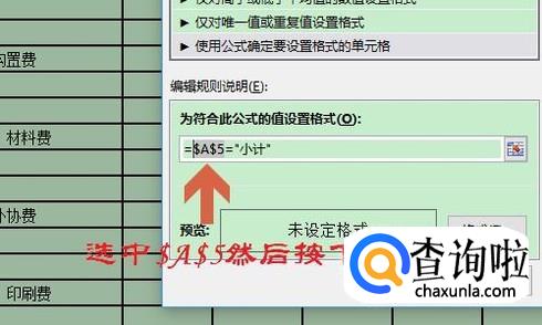我们首先输入“=”号,然后点击A5单元格(表格正文中的第一个单元格)选中它,接着再输入="小计"(注:小计两侧用英文状态下的引号)