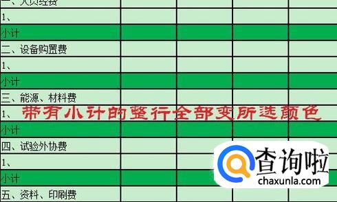 挑选一种自己喜欢的颜色,点击确定返回到表格中,我们就会发现带有小计的这一行全部变成了所选颜色,而且以后我们在A列的其他单元格输入小计两字,这一行也会自动变为这种颜色;