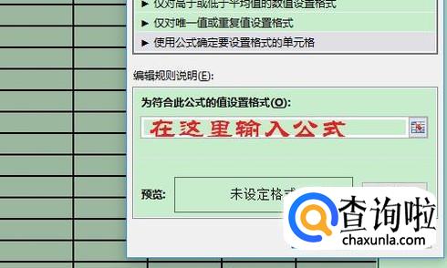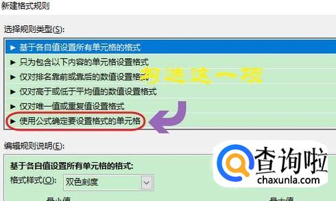 在弹出的新建格式规则对话框,我们选择其中的“使用公式确定要设置格式的单元格”这一项,接着对话框下方就看到了输入公式的输入框,见图二;