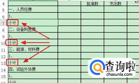下图是一张经费支出明细表,从中我们可以看出有很多行名称为“小计”,也就是用来统计不同类型项目费用的,见下图...