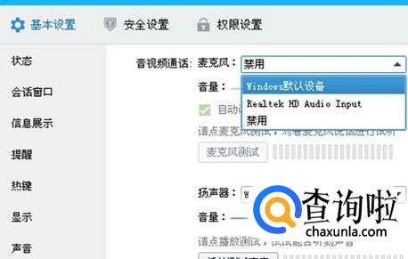 在音视频通话设置里,看看麦克风是否禁用,禁用的话就点小框内的下拉箭头,选择其它两项都行。