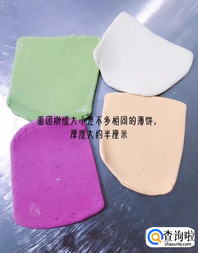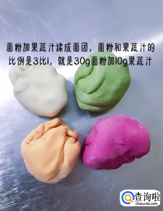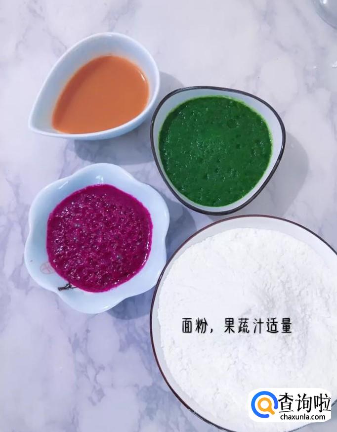 食材:胡萝卜汁,火龙果汁,菠菜汁,面粉。