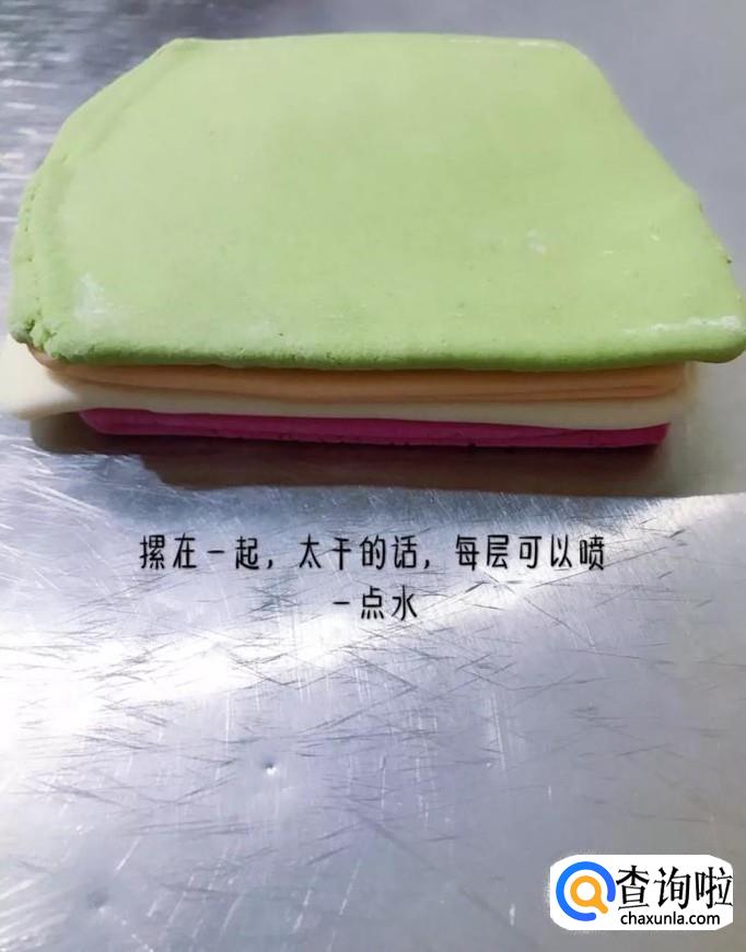 接着把所有的面饼堆起来,如下图所示。小贴士:大家可以在夹层中喷洒一些清水。