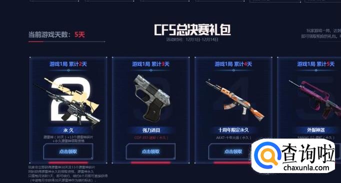然后还有总决赛游戏天数礼包,可以领4把枪哦,如下图所示。