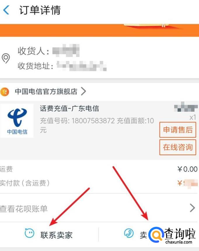 来到订单详情页面,在这里我们可以在线‘联系卖家’,或直接打卖家电话和卖家说明情况,要求其再次充值就行了。