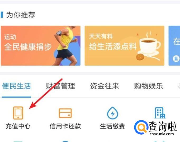 打开手机支付宝app,点击‘充值中心’