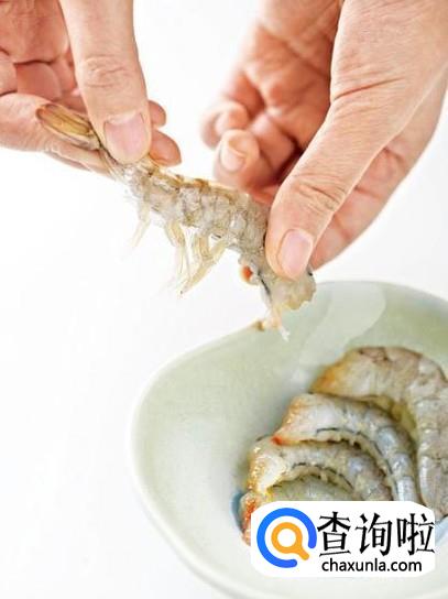 捏住虾的身子部位,然后将虾尾往后一拽,就可以把整个虾子都完好无损的剥下来。