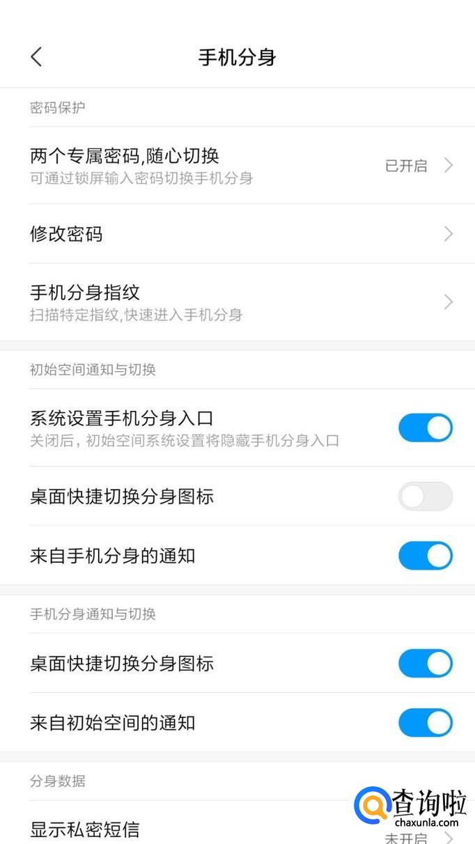 在这里还有很多其他的关于手机分身的设置,例如设置手机分身的指纹,在初始空间的手机分身图标等等,还能选择是否在两个空间显示另外一个空间的通知,如果关闭的话在另外一个空间就不会收到提示,会提高隐蔽性,但是也会提高错过消息的可能性。