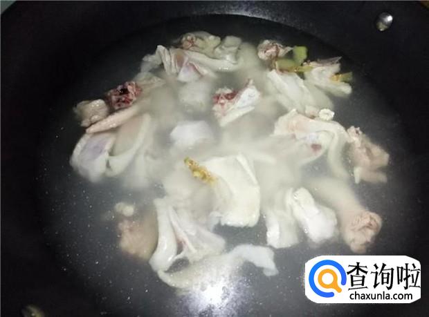 锅里放入姜片,滴入几滴料酒,把水烧开,然后放入清洗好的鸡肉,鸡肉大概烫3分钟,即可捞起来,料酒可以去腥味。