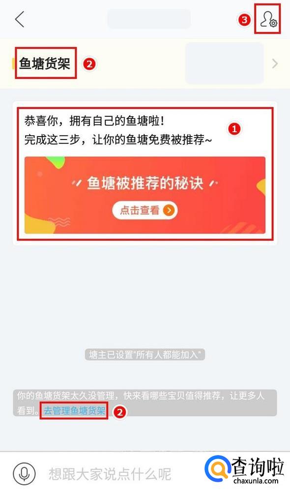 创建好鱼塘,完成三步可以使自己的鱼塘被推荐,还可以把自己的宝贝挂到货架上,右上角是用于管理鱼塘的;