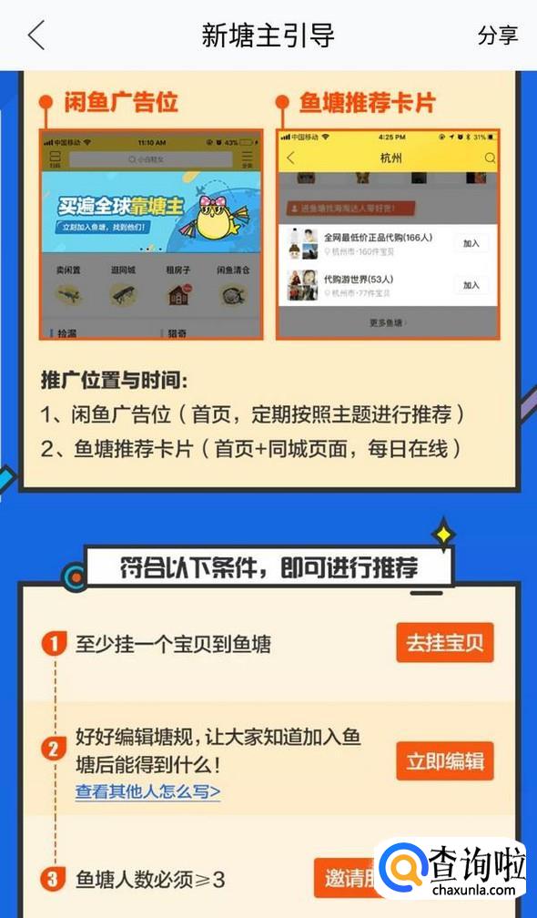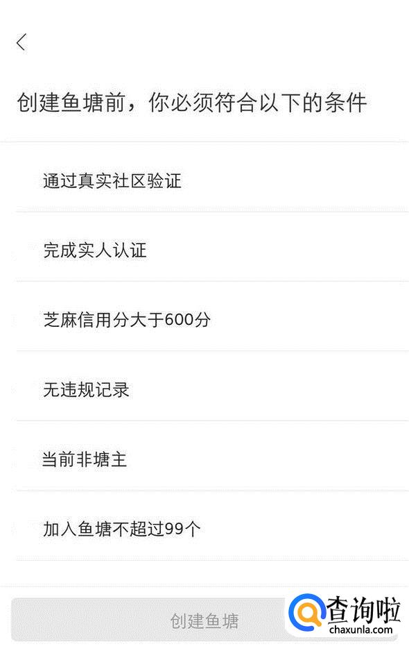 创建鱼塘要满足所列出的条件,否则只能加入别人的鱼塘;