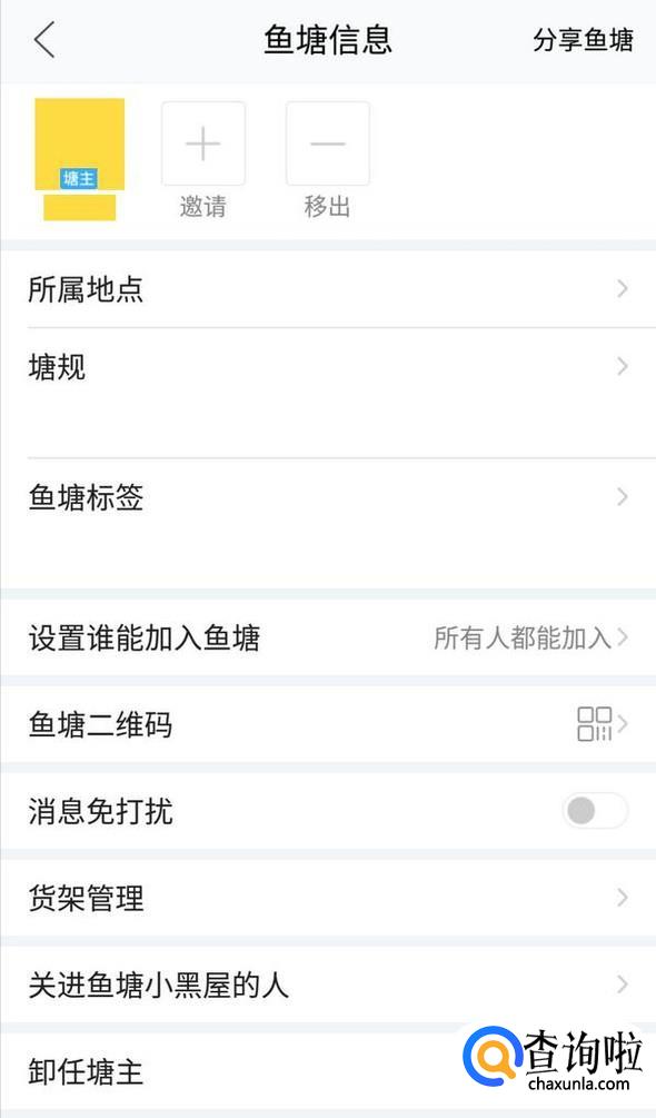 管理鱼塘界面的设置选项也都很清楚,主要是设置塘规、鱼塘标签和设置谁能加入鱼塘等;