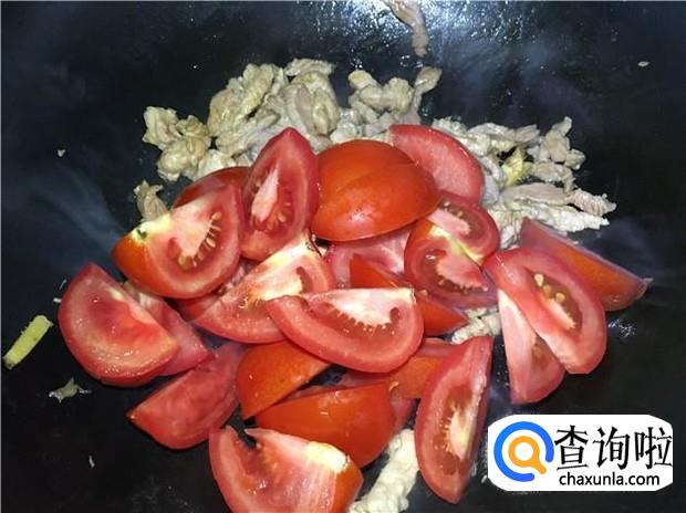 把瘦肉炒到变颜色后,即可加入西红柿,加入少许蚝油,翻炒均匀。